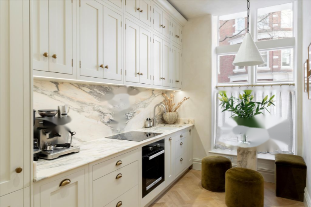 Ручная кухня оформлена по высочайшему стандарту с индивидуальными шкафчиками, встроенной техникой Miele и изысканными деталями. Ее элегантный дизайн и продуманная планировка дополняют общую эстетику дома, создавая стильное и хорошо оборудованное пространство для кулинарии.