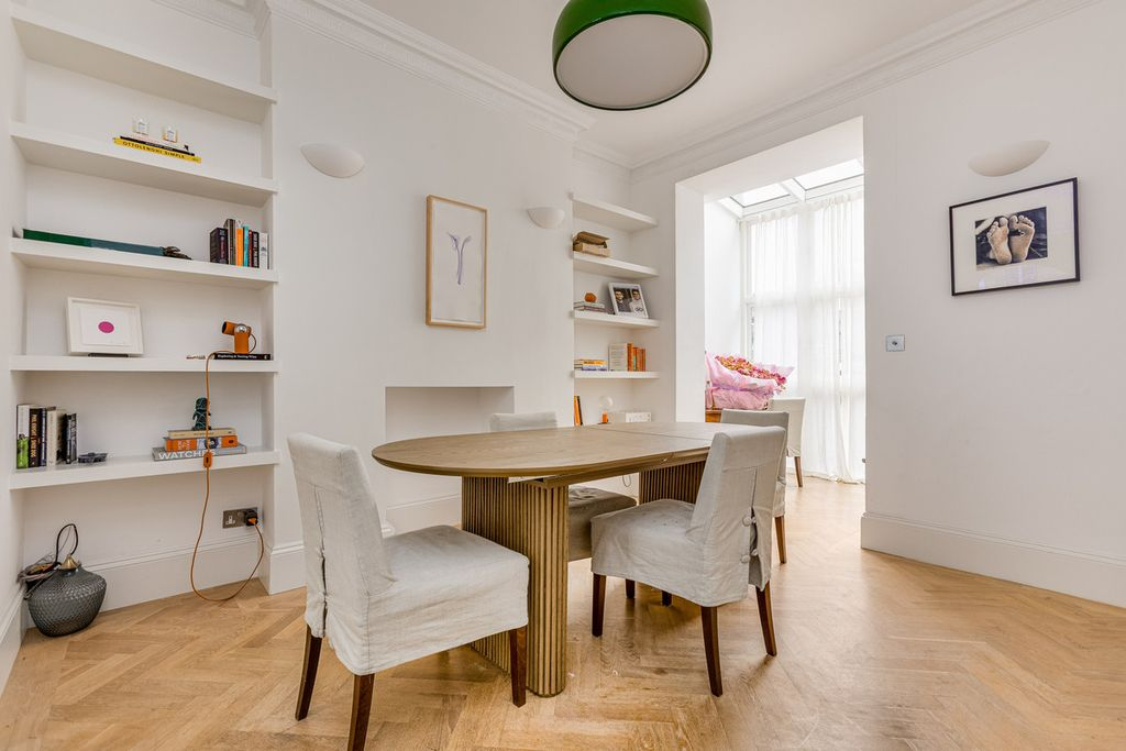 На первом этаже просторная гостиная с высокими потолками и отличным естественным освещением плавно переходит в отдельную столовую зону. Далее находится универсальное рабочее пространство в современной стеклянной пристройке, создающей яркий контраст с историческим характером здания. На заднем плане располагается современная, хорошо оборудованная кухня с прямым выходом в сад, выходящий на запад, что идеально подходит для приема гостей на открытом воздухе. Существует также дополнительный выход на Stewards Grove за домом.