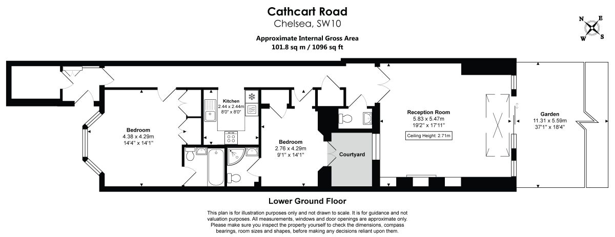 Квартира расположена на Cathcart Road, Chelsea (SW10) и обладает собственной входной дверью. Включает в себя: прихожую, основную спальню с прилегающей ванной комнатой, вторую двухместную спальню (также с душевой комнатой), гостевой туалет, отдельную кухню и невероятную гостиную, ведущую в сад длиной 40 футов.