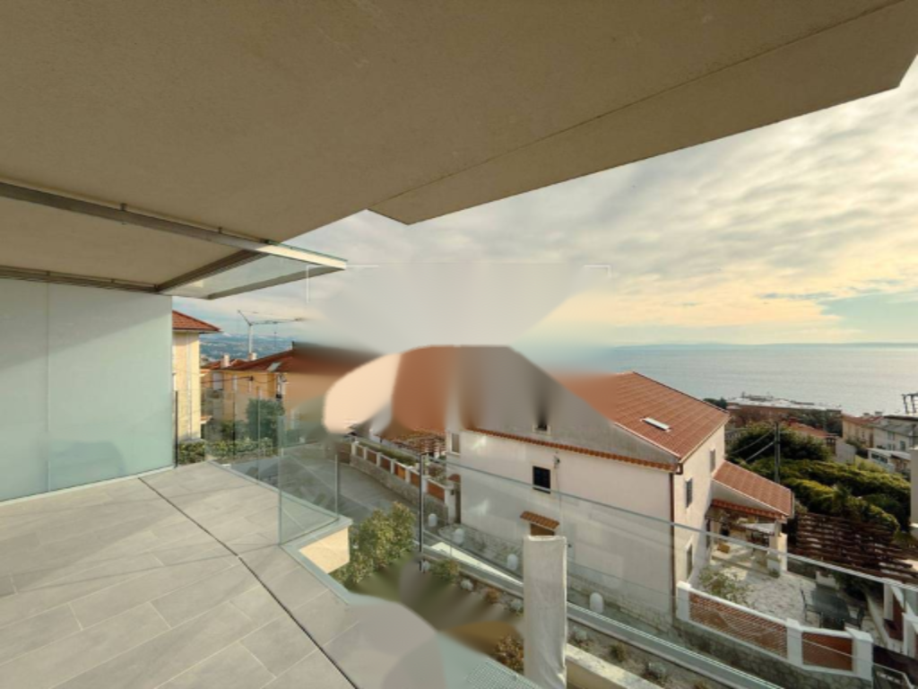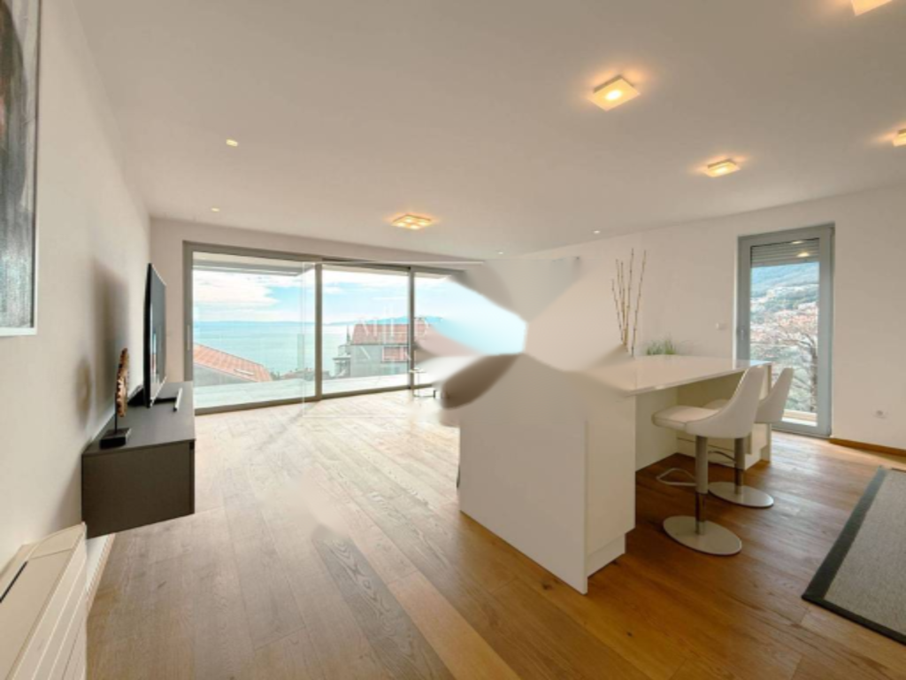 Общая площадь составляет 103 м² и включает светлый и просторный открытый зал, вмещающий гостиную, кухню и обеденную зону. Квартира предлагает уникальный панорамный вид на море и Опацию с красивого балкона. Интерьер продуман с акцентом на функциональность и элегантность: имеется входная зона, две спальни с встроенными шкафами и отдельными ванными комнатами, и гостевой санузел.