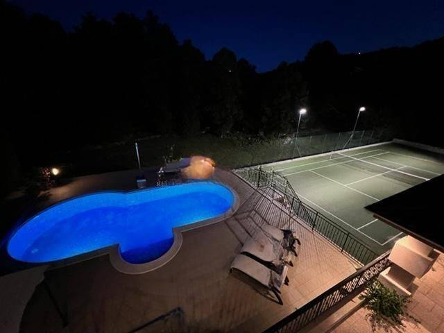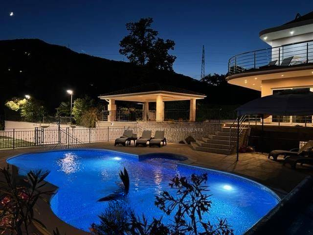 Участок с бассейном и зоной для загара, рядом с бассейном находится теннисный корт, а выше — большая терраса с красиво оформленной беседкой. Вид открывается на окружающую зелень, бассейн и теннисный корт. Вилла продается полностью меблированной. ♂️