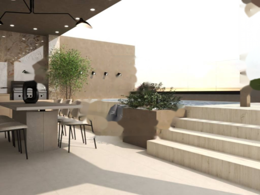 На втором этаже расположены: спальня, гостевой туалет, две ванные комнаты, коридор и прачечная, а также просторная гостиная с открытой планировкой, включающей кухню и столовую. Из этой зоны есть выход на крытую террасу с бассейном. На третьем этаже находятся две дополнительные спальни и ванная комната. Общие зоны включают тренажерный зал и спа. В подарок к квартире идут два гаражных места и одно общее парковочное место.
