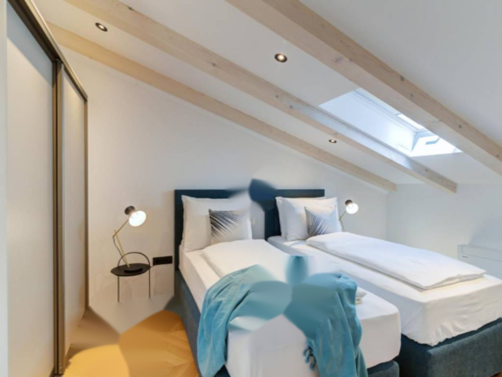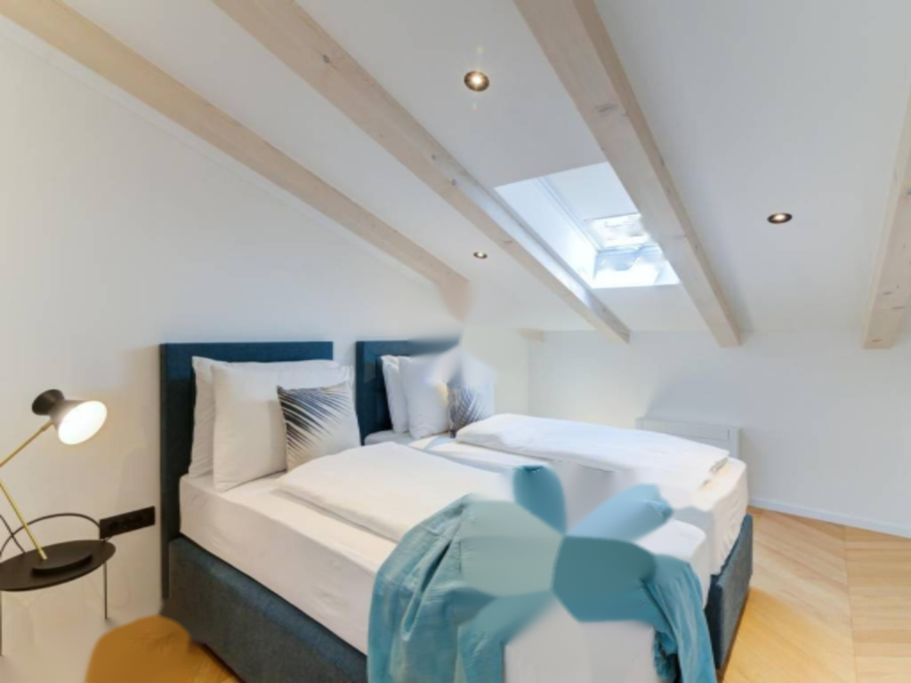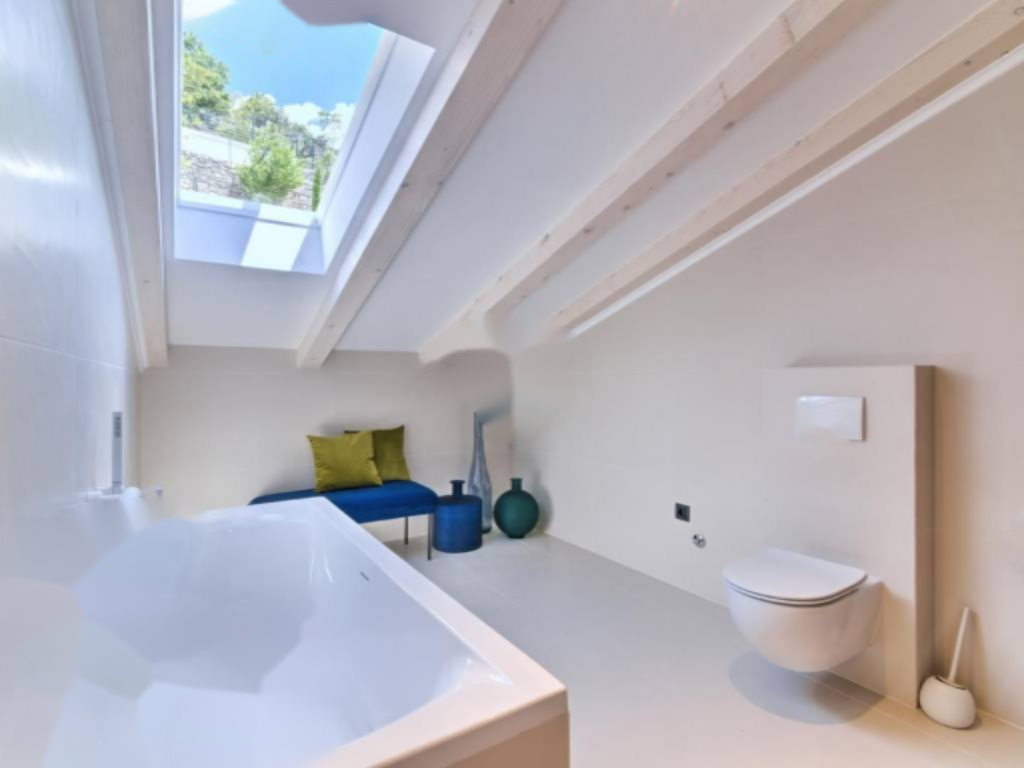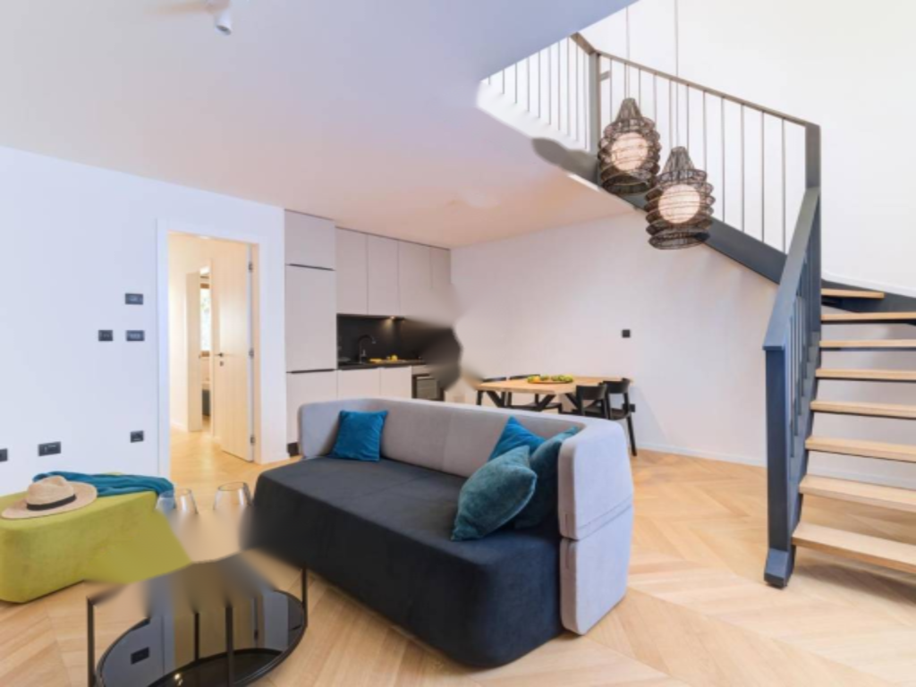 На втором этаже апартамента расположены: спальня, гостиная с кухней и столовой зоной, ванная комната и коридор. На мансардном этаже — еще одна спальня и ванная комната. Внутренняя отделка выполнена из высококачественных материалов: керамика Appiani и Florim, арочная лестница из древесины лиственницы и протекущей дверной системы.