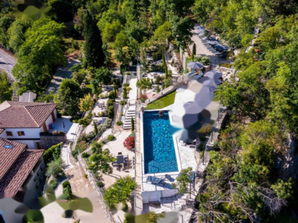 Комплекс также располагает просторным общим бассейном (60 м²) с панорамным видом на море. Квартира имеет собственный благоустроенный сад площадью 166 м², доступ к бассейну и террасе для загара, а также отдельное парковочное место в гараже.