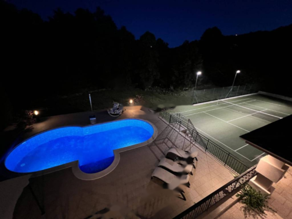 Вилла выполнена в современном стиле и полностью меблирована. На прилегающей территории, площадью 1443 м², расположены бассейн и теннисный корт.