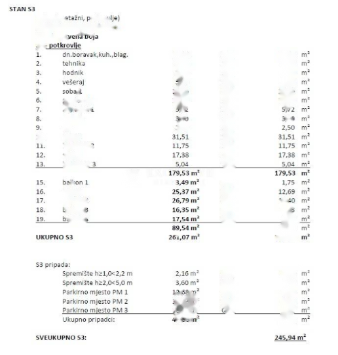 Общая площадь квартиры составляет 179,53 м² и включает в себя просторную гостиную с кухней и столовой, три спальни, три ванные комнаты, гардеробную, прачечную, два коридора, туалет и техническое помещение. Особую ценность добавляют терраса и четыре балкона с общей площадью 89,54 м², увеличивая общий жилой пространство до 261,01 м².