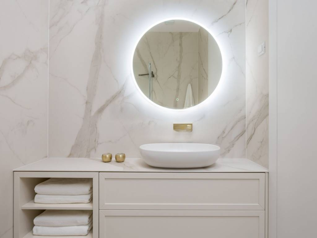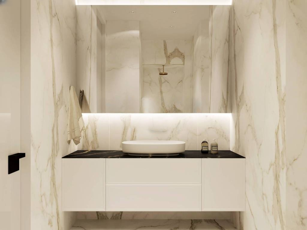 Просторная квартира площадью 91 м² расположена на первом этаже двухэтажного здания. Обладает роскошным интерьером и продуманным дизайном. Состоит из прихожей, трех ванных комнат, уютной гостиной, совмещенной с кухней и столовой, а также двумя спальнями.