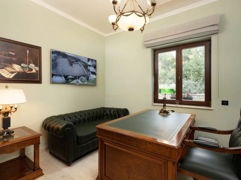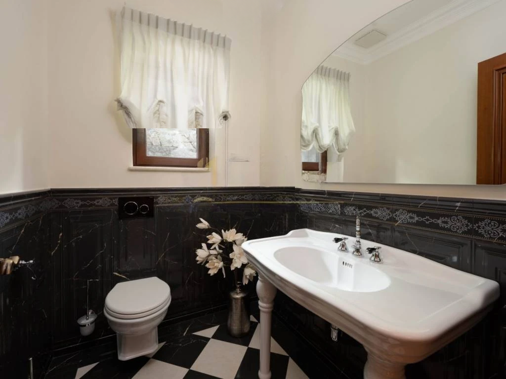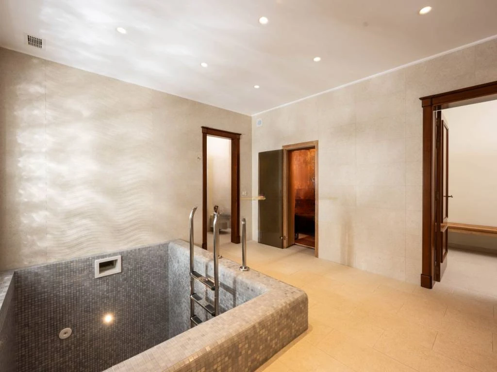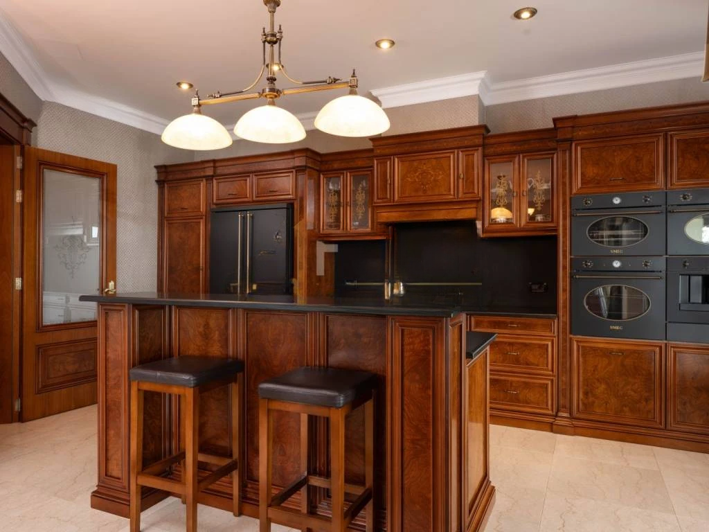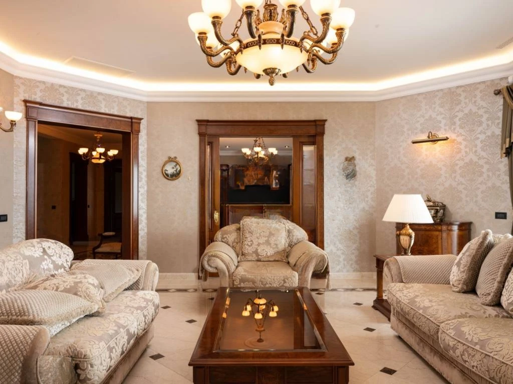 Интерьер тщательно спланирован и оборудован высококачественными материалами. Полы из итальянского мрамора сочетаются с теплом паркета из африканского дуба, создавая гармонию роскоши и комфорта. Камин в гостиной добавляет особую атмосферу. Каждый элемент, от декоративных настенных техник и обоев до первоклассных керамических плит и сантехники, выбран с акцентом на эстетику и качество. Мебель и внутренняя столярка изготовлены на заказ, кухня оснащена премиальными приборами.
