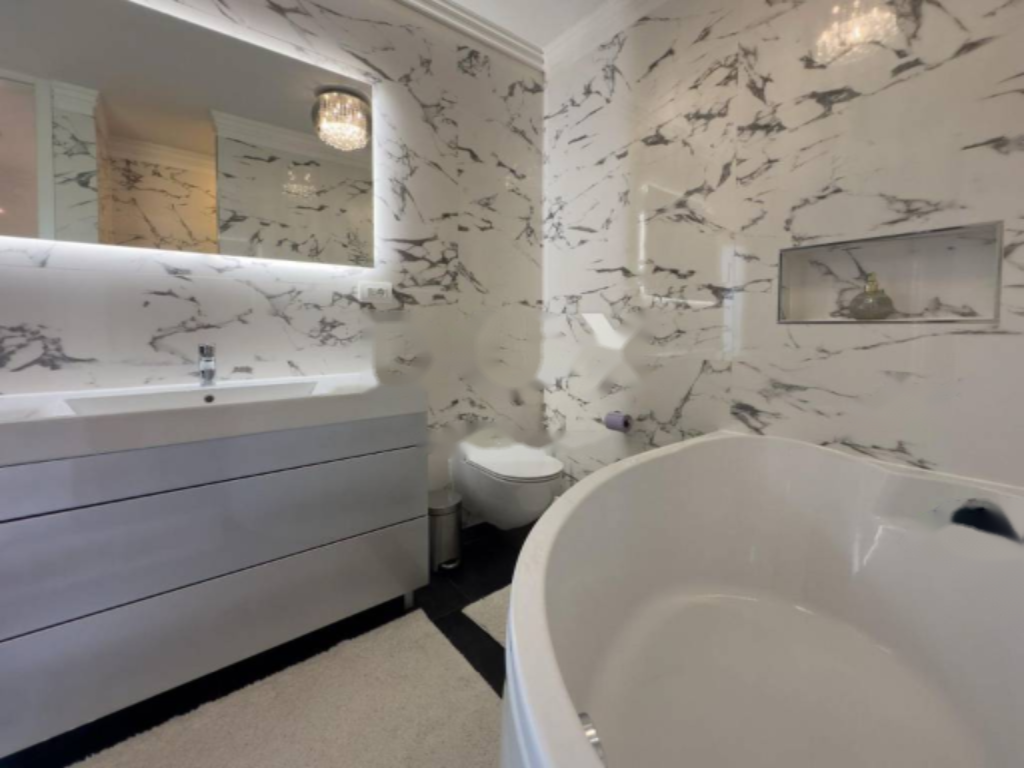 Площадь жилья составляет 118 м², также доступны 438 м² коммерческих помещений. После полной реконструкции в 2023 году установлены новые электропроводка и водоснабжение, выполненные из материалов высокого качества от известных производителей. Интерьер тщательно продуман, а мебель от брендов Natuzzi и Cadoro придаёт обстановке изысканность и элегантность. Для оптимального семейного проживания предусмотрена просторная главная спальня, гостевая и детская спальни, современная ванная комната с естественным освещением, объединённая гостиная с кухней и столовой зоной, а также вместительная кладовая. Из каждой комнаты, включая ванную, есть выход на отдельный балкон, что является редкостью для подобных объектов.