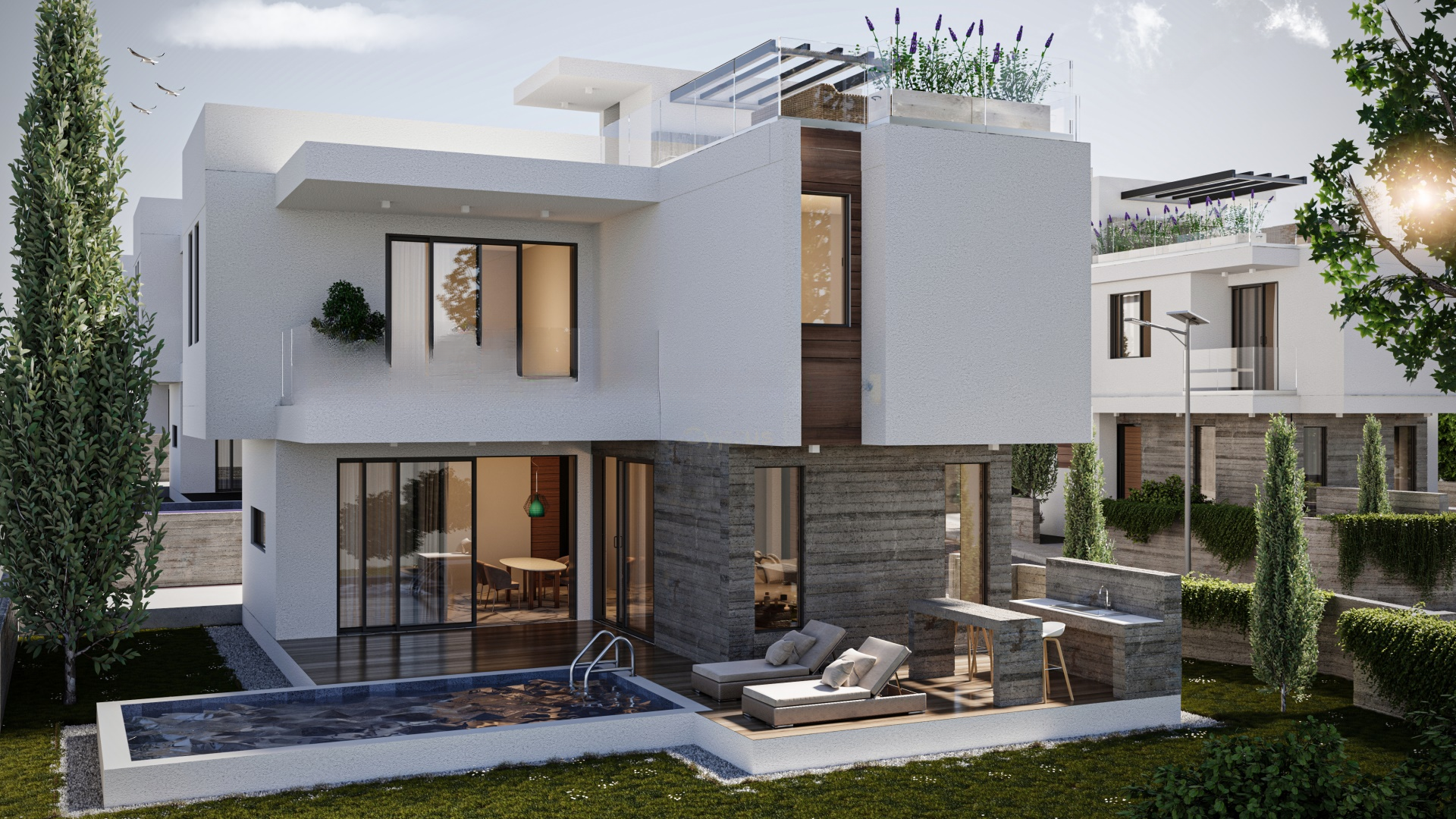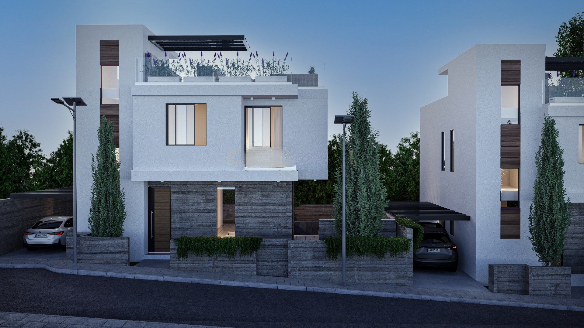 Вилла состоит из трех прекрасно оборудованных спален, трех современных ванных комнат, стильной кухни и комфортной гостиной. Для комфорта предусмотрены полы с подогревом и кондиционирование воздуха. Также имеется закрытое парковочное место для одного автомобиля. Энергоэффективность обеспечивается наличием сертификата класса А.