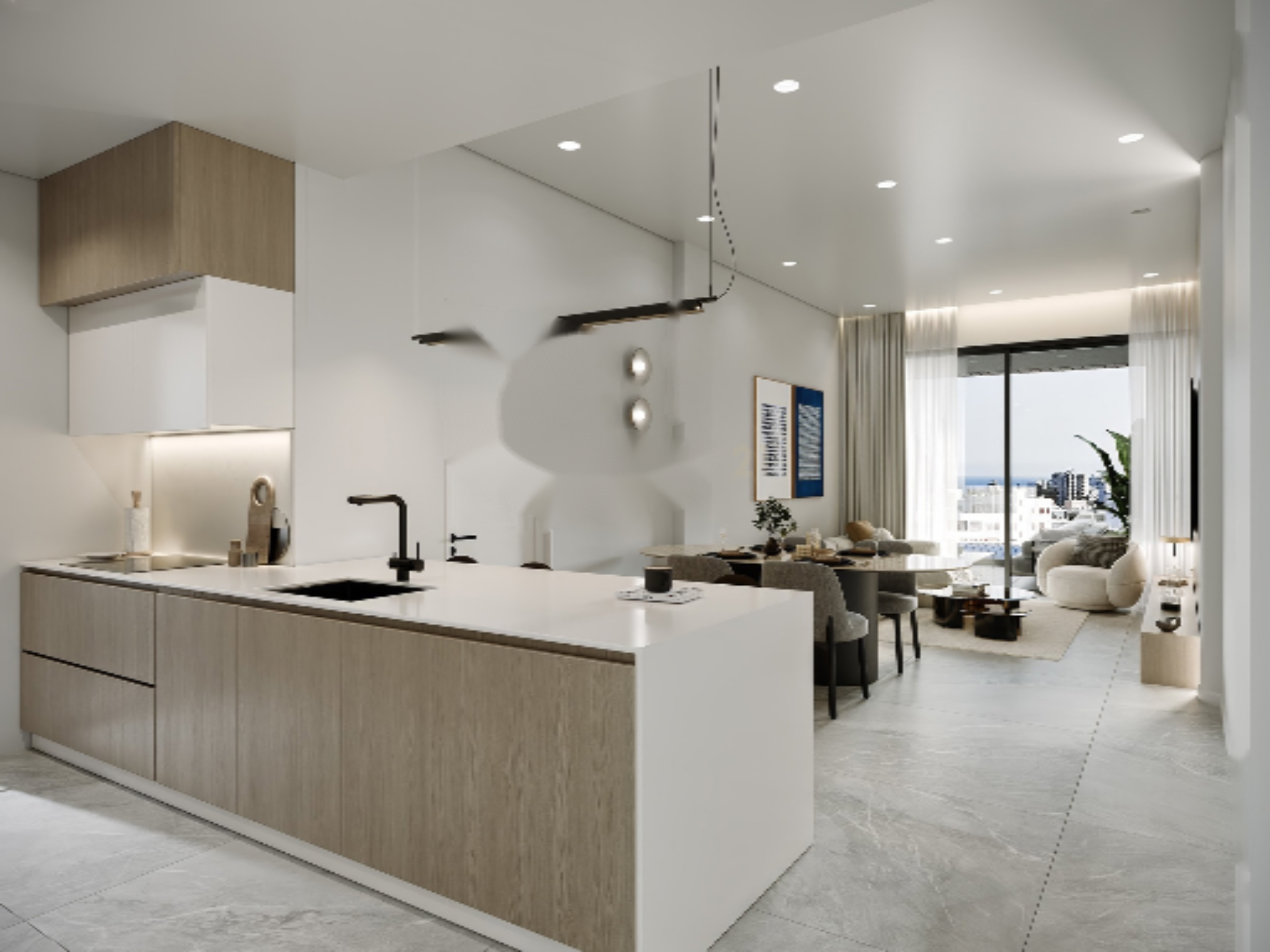 Апартаменты оснащены высококачественной керамической плиткой и ламинатными паркетными полами, а также современными итальянскими кухонными шкафами и гардеробами. Потолки на кухнях, в туалетах и в коридорах будут украшены гипсовыми панелями и встроенными светильниками, создавая современный и элегантный облик.
