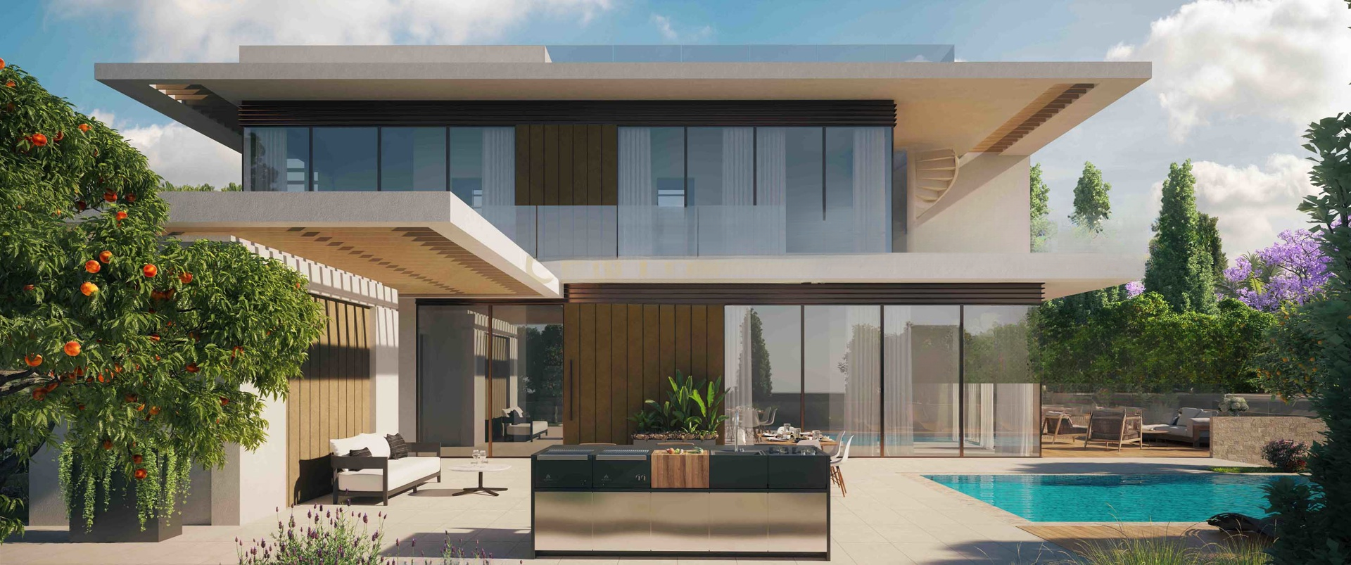 Примененные технологии умного дома позволяют легко управлять освещением, климатом и безопасностью. Бескрайний бассейн добавляет нотку элегантности, идеален для отдыха и развлечения гостей. Просторные спальни обеспечивают комфорт и приватность, что делает его идеальным для семейной жизни. Частная парковка гарантирует безопасное и удобное место для нескольких автомобилей, а окна с двойным остеклением повышают энергоэффективность и звукоизоляцию, способствуя спокойной и комфортной атмосфере.