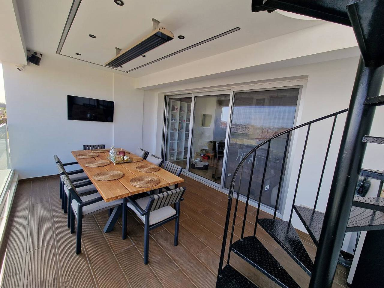 Особое преимущество пентхауса — просторная терраса на крыше, идеальная для отдыха или приема гостей. Также в комплекте идут два крытых парковочных места и кладовая. Это идеальный выбор для современной городской жизни.