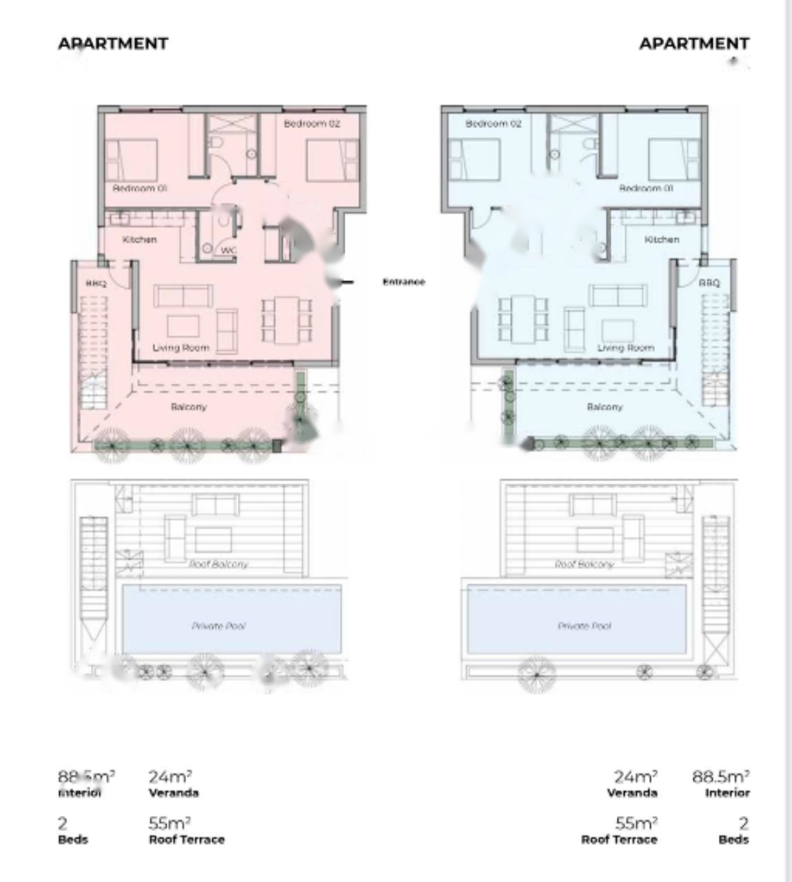 Просторные двухкомнатные квартиры – все спальни снабжены отдельными ванными комнатами для максимальной приватности и удобства.