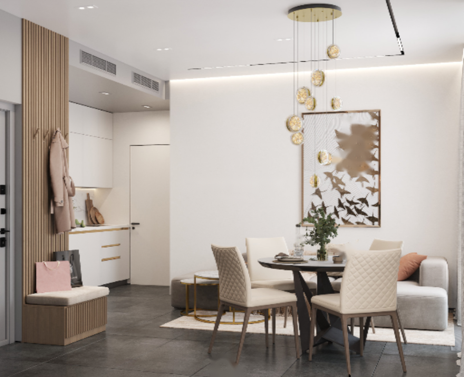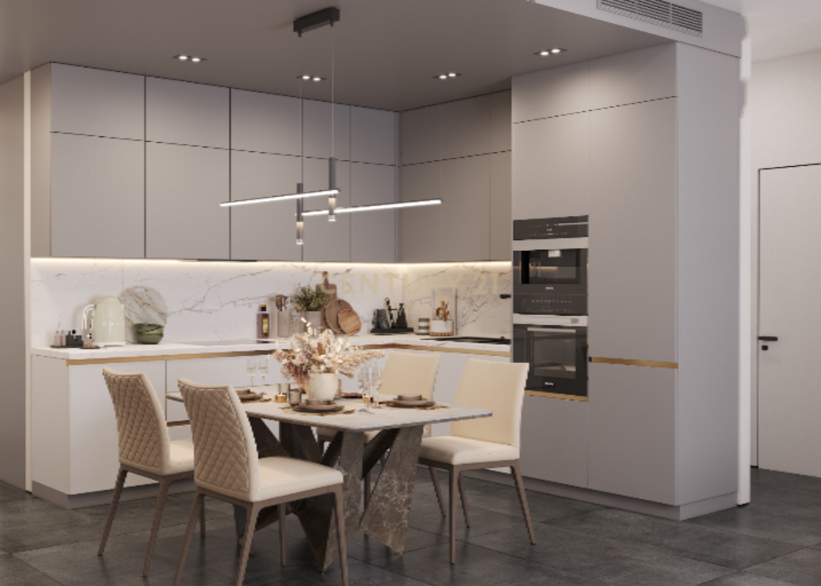 Открытая кухня и гостиная зона образуют единое пространство, идеально подходящее для отдыха или приёма гостей. Большой балкон с стеклянными перилами предоставляет идеальные условия для обедов на свежем воздухе круглый год.