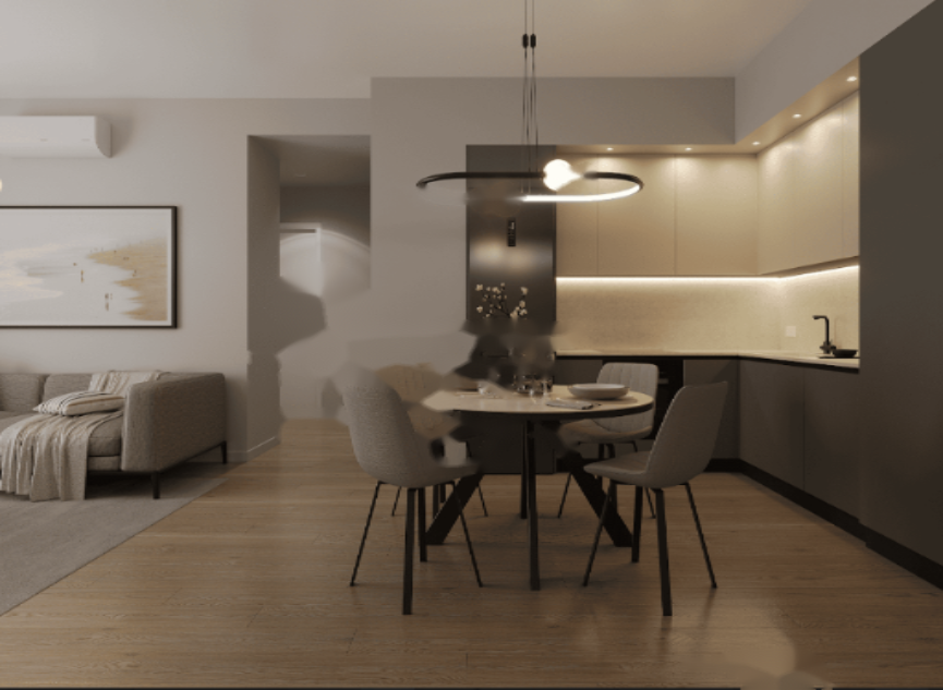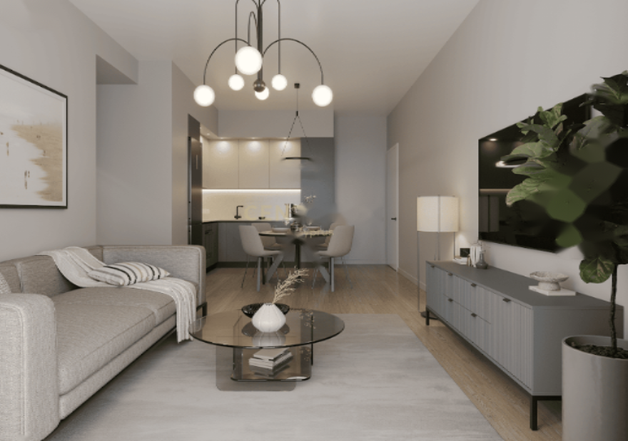 Расположенная на первом этаже, квартира площадью 57.11 кв.м. включает одну спальню, современную ванную комнату и светлую гостиную с кухней открытой планировки и видом на город. Дизайн сочетает функциональность и современную эстетику, создавая приятное и практичное жилое пространство.