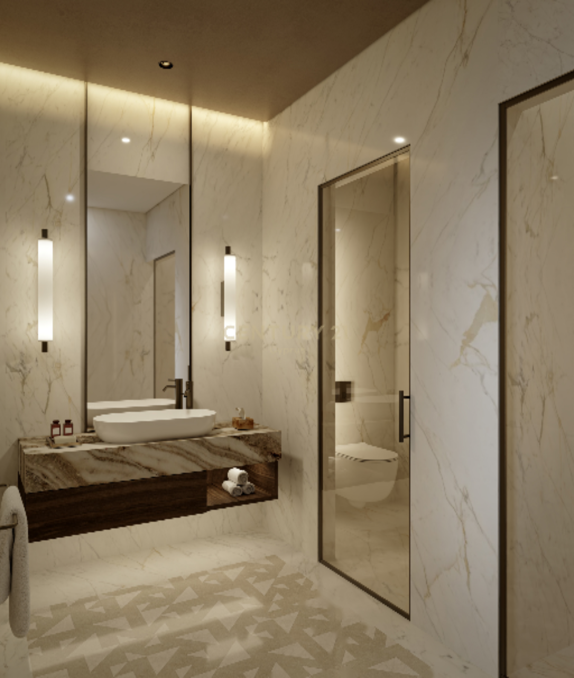 Проект разработан с акцентом на комфорт и изысканность: имеется тёплый пол, кондиционер, электрическое отопление, двойные стеклопакеты и соблюдены стандарты энергетической эффективности класса A.