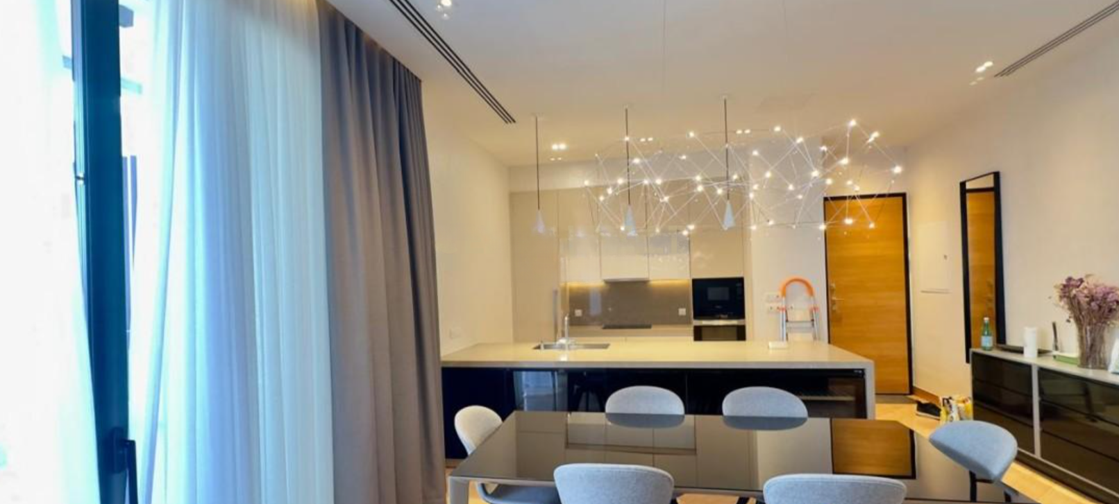 Квартира оснащена подогревом полов и кондиционированием VRV, соответствует классу энергоэффективности A, имеет двойные стеклопакеты и электрические жалюзи. Электроприборы, такие как посудомоечная и стиральная машины, уже включены, а также имеются москитные сетки и система безопасности с видеонаблюдением.