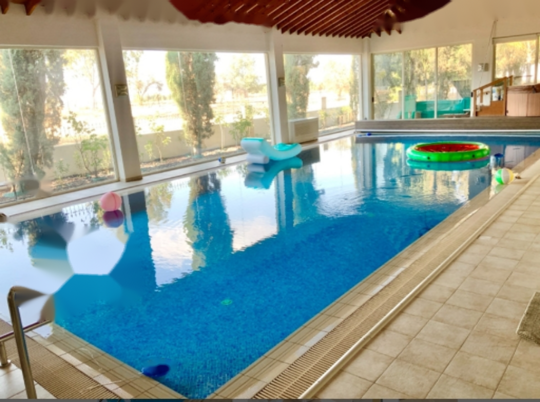 Внутренний подогреваемый бассейн 7 м x 15 м, джакузи (рядом с бассейном) и сауна, 2 гостиные (открытая планировка вместе со столовой и главной кухней), одна комната под офис.
