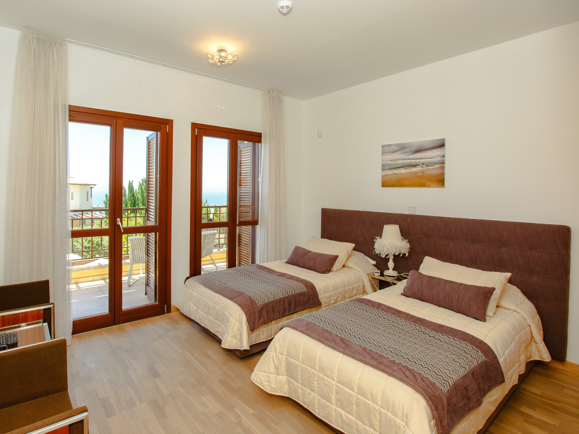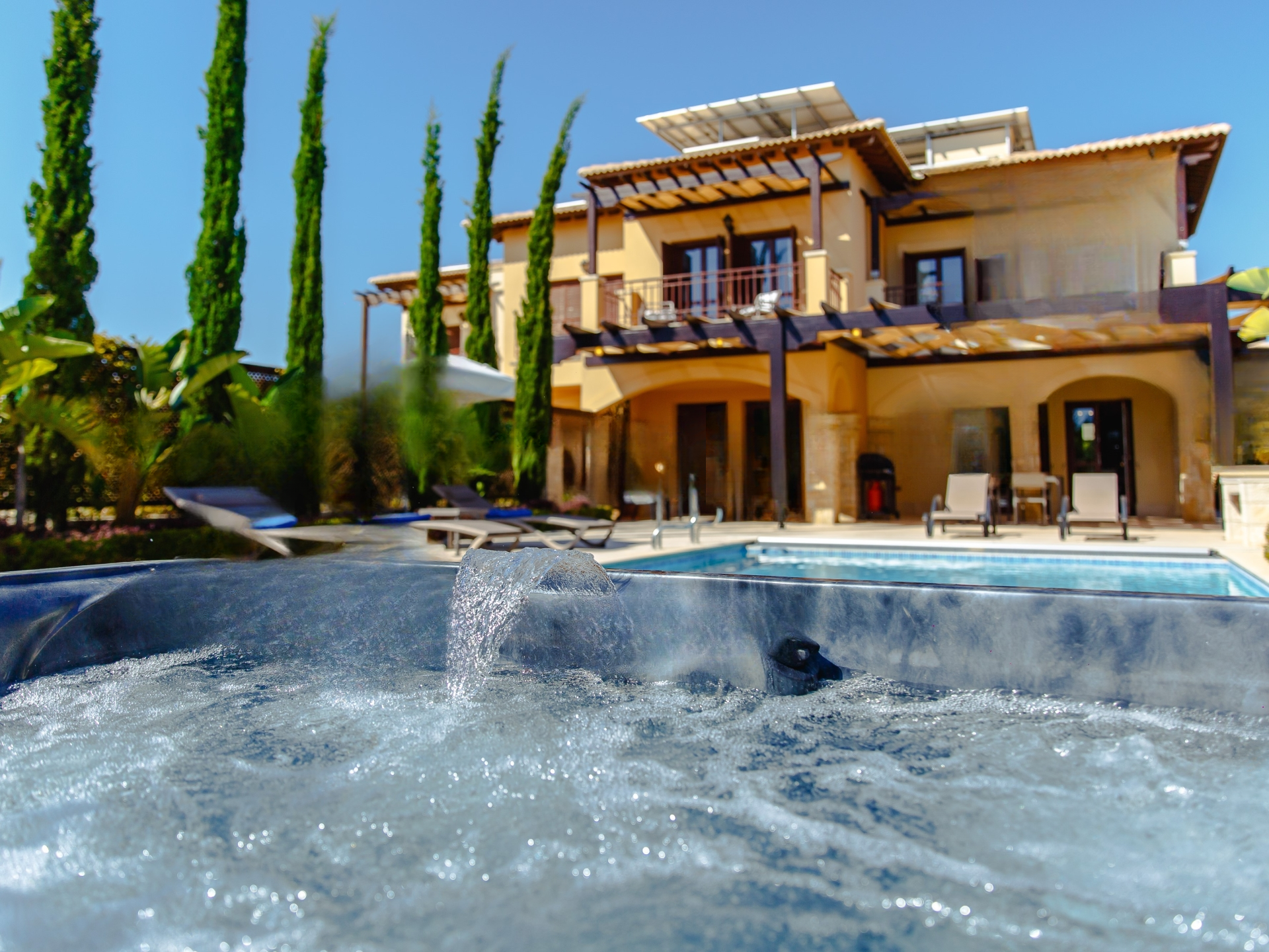 На улице вас ожидает частный бассейн, окруженный красиво оформленным садом, где можно расслабиться или проводить встречи с друзьями. Воспользуйтесь джакузи для полного расслабления, а также передовыми технологиями умного дома и охранной системой для вашего спокойствия.