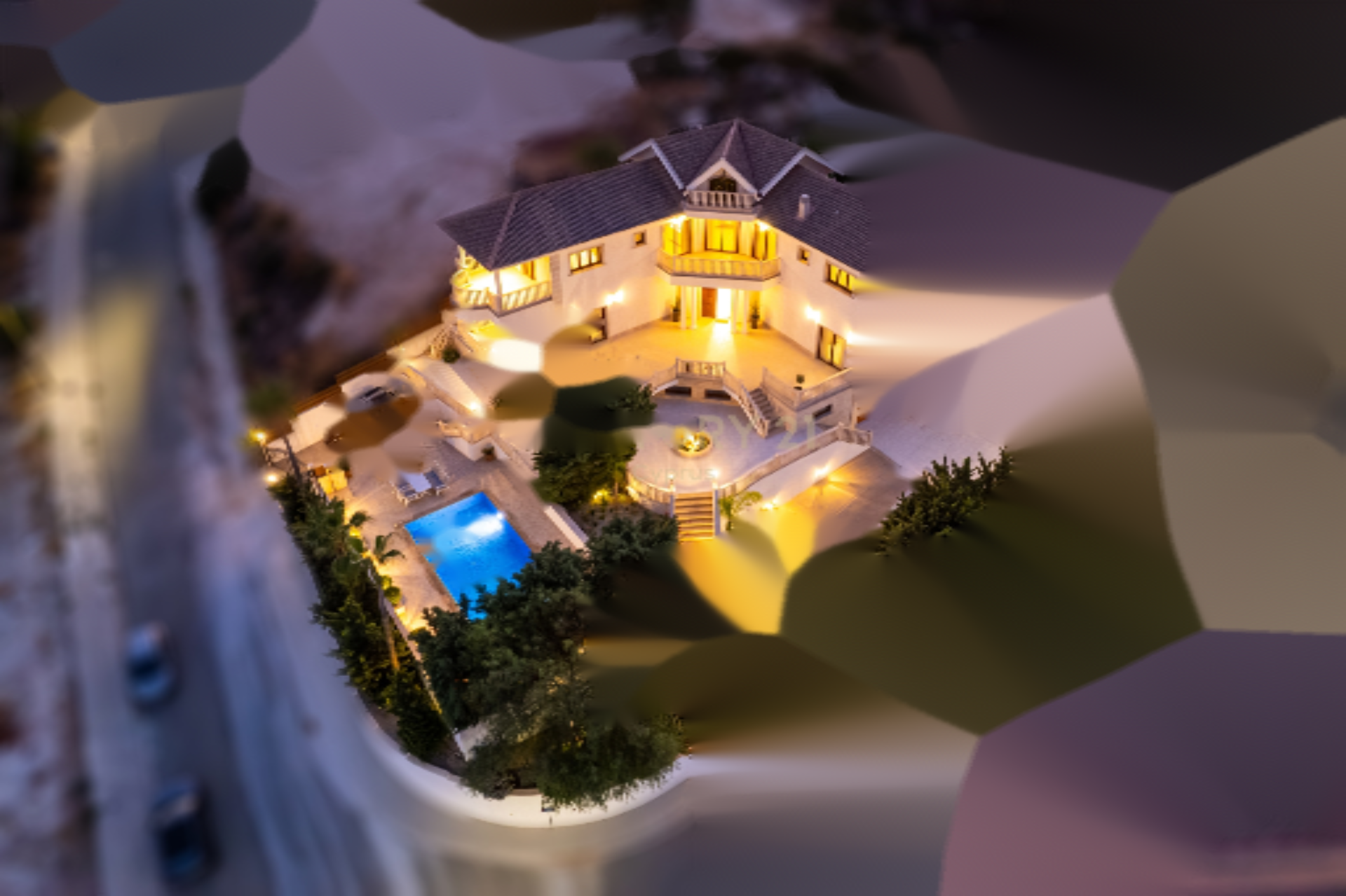На территории находятся две зоны для барбекю и зрелые сады. В центре установлен ручной фонтан, беседка, выполненная из камня и мрамора, тренажерный зал и частный чердак. Фотоэлектрическая солнечная система, которая полностью обеспечивает объект энергией.