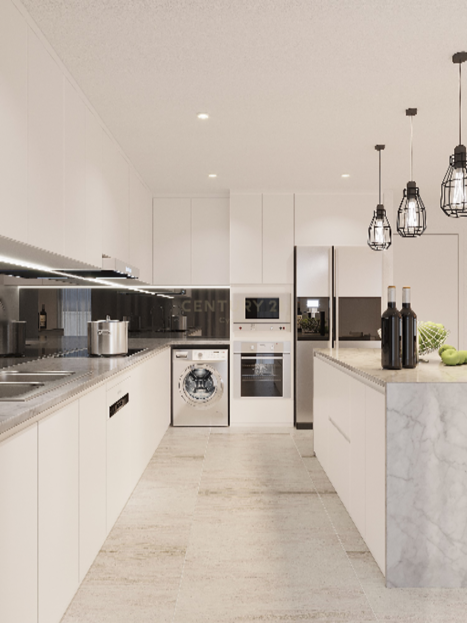 Большая кухня оснащена зоной для приготовления пищи, удобным кухонным островом и обеденным столом, покрытыми изысканным натуральным мрамором. Установлены навесные шкафы с системой магнитного закрытия, обеспечивающие больше места для хранения и готовки. Поверхность шкафов выполнена из блестящего, роскошного ламинатного дерева, которое обладает устойчивостью к теплу, царапинам и влаге.