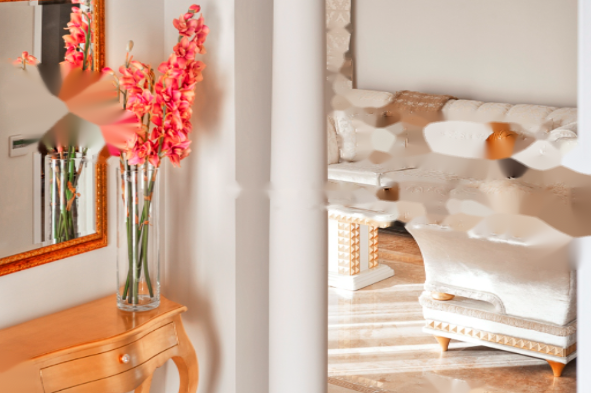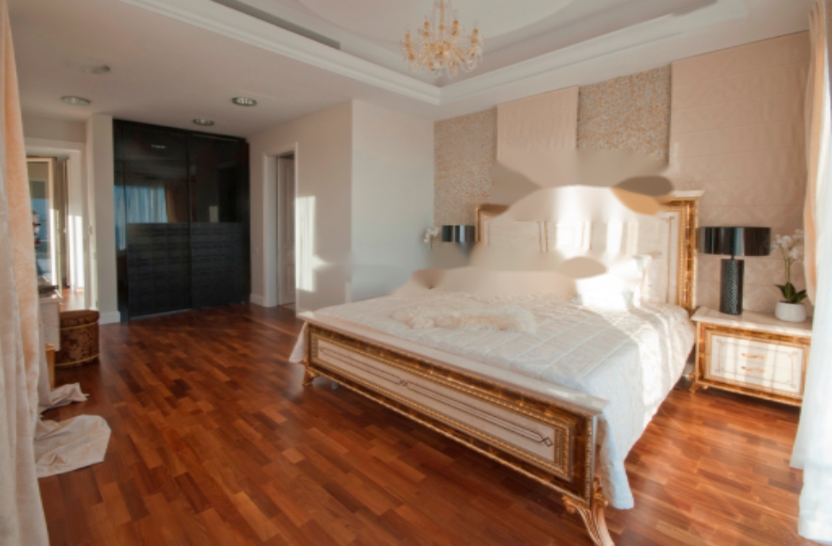 Эта неоклассическая вилла выполнена в нейтральных бежевых тонах. На полах уложен итальянский мрамор травертин, декоративные вставки Versace, итальянская кухня с стеклянными поверхностями, столешница из био-материала Corean DuPont, сантехника от Villeroy & Boch. ️ На первом этаже расположен парадный вход с подсветкой на полу, колоннами и мрамором цвета богатого шоколада. Вилла D имеет встроенный в пол бассейн с джакузи.