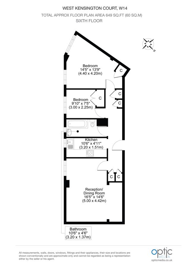 Просторные апартаменты на шестом этаже, площадью 645 квадратных футов, расположены в здании с круглосуточной охраной напротив станции метро West Kensington. В квартире есть две спальни (двуспальная и односпальная), большая гостиная, отдельная кухня и ванная комната. Гостиную можно преобразовать в третью спальню, что делает планировку идеальной для трех жильцов.
