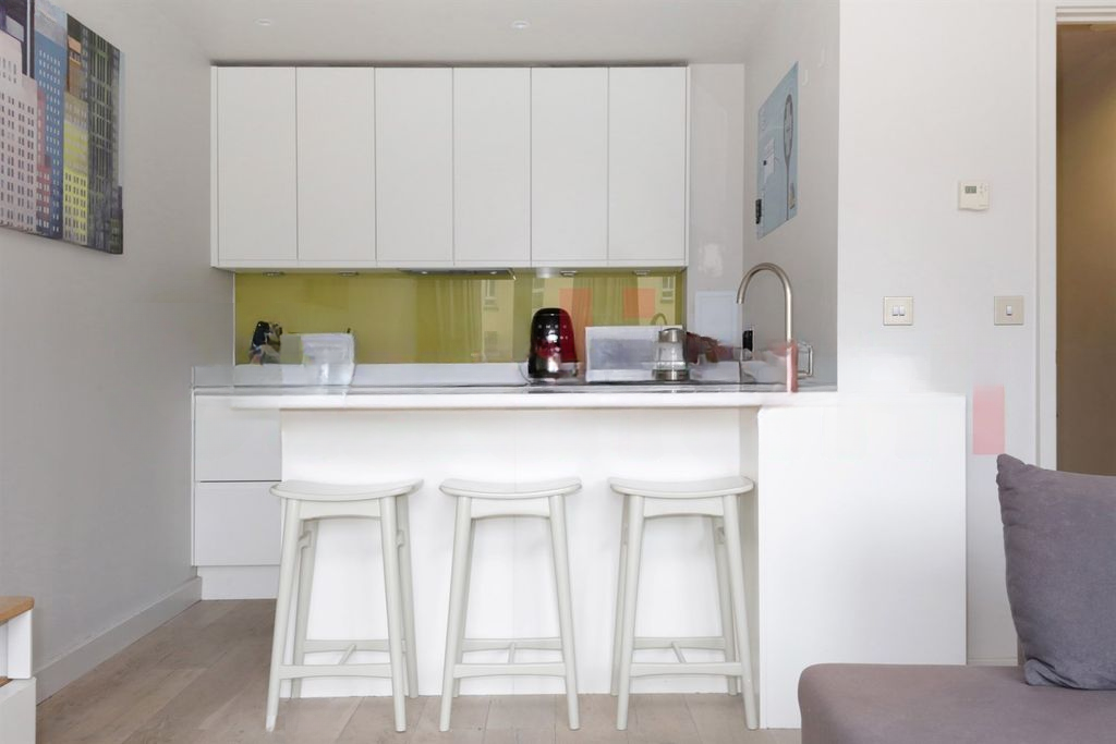 Современная кухня John Lewis с рабочими поверхностями из кориана и барной стойкой для дополнительного рабочего пространства, оснащена 4-конфорочной индукционной плитой, встроенной стальной духовкой и вытяжкой. В комплект входит встроенная посудомоечная машина, холодильник/морозильник и стальная раковина.