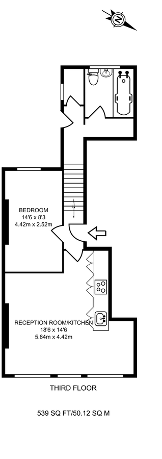 1 bed, 1 bath, 1 reception, 539 sq. ft;