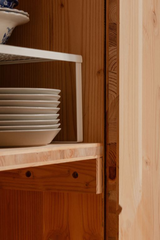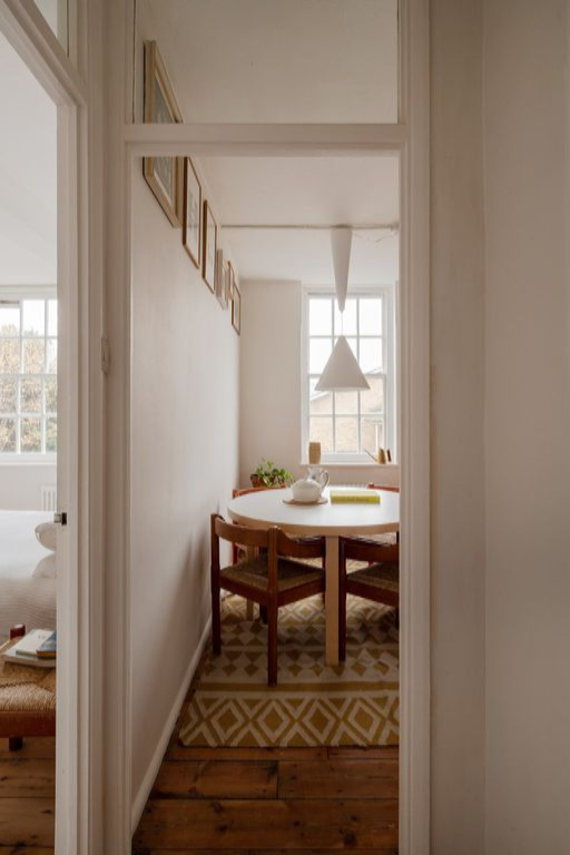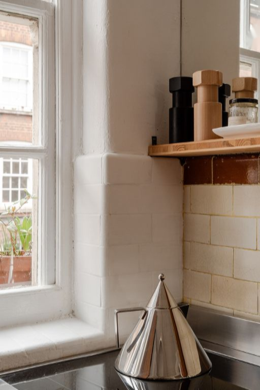 Гостиная наполняется утренним светом через окна с двойными рамами, под которыми расположен новый радиатор в колоннах, игриво отсылающий к истории здания. Индивидуальные полки Tilly Board притягивают взгляд и обогащают яркую палитру комнаты. Тёплый серый линолеум ведет в кухню, где текущие владельцы обнаружили оригинальные плитки. Дальнейшие элементы инкрустации Tilly Board обрамляют или скрывают кухонные потребности, а аккуратно установленные зеркала усиливают пространство комнаты.