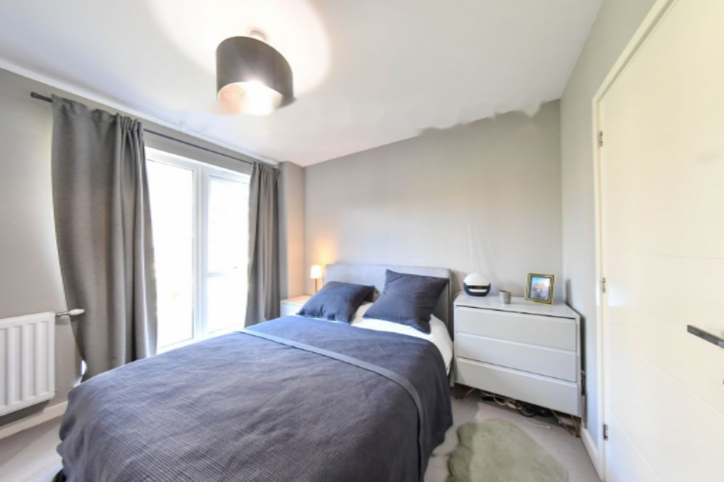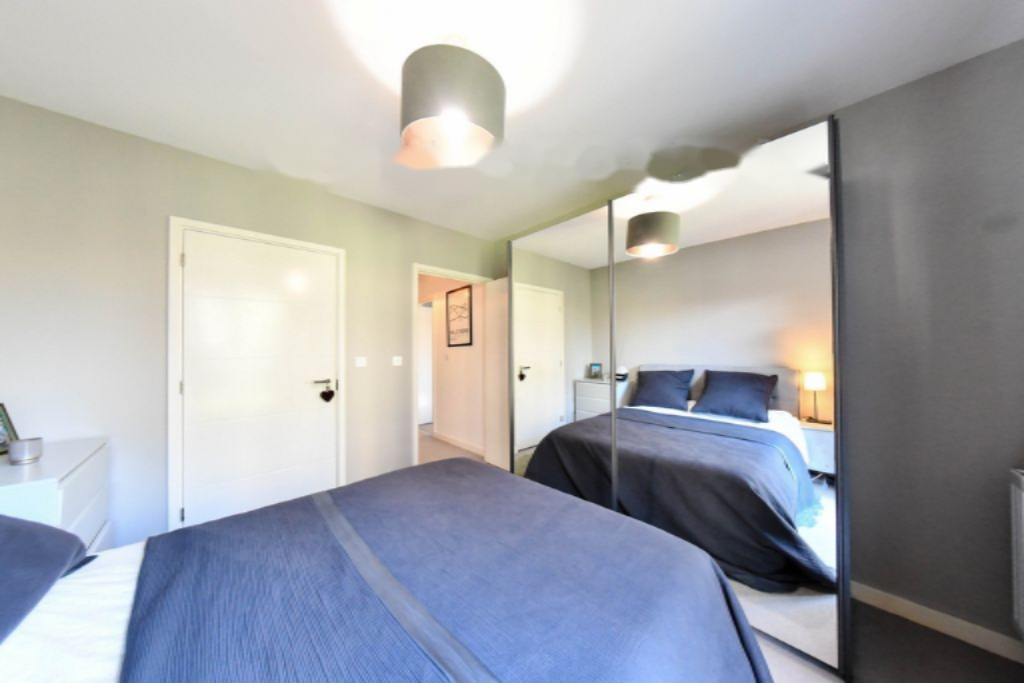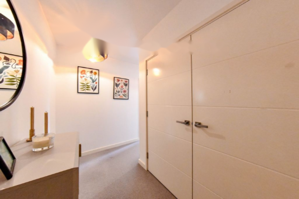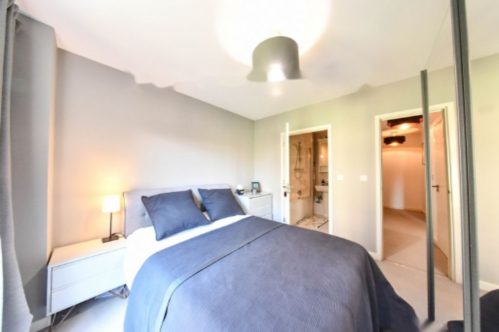 Просторная спальня спроектирована для комфортного проживания, с встроенным хранением и обилием естественного света. Ключевой особенностью квартиры является современная ванная комната, которая служит как ensuite к спальне, так и основной ванной для гостей. Оформлена с высоким стандартом, включает стильную плитку, ванну с верхним душем и современные элементы.