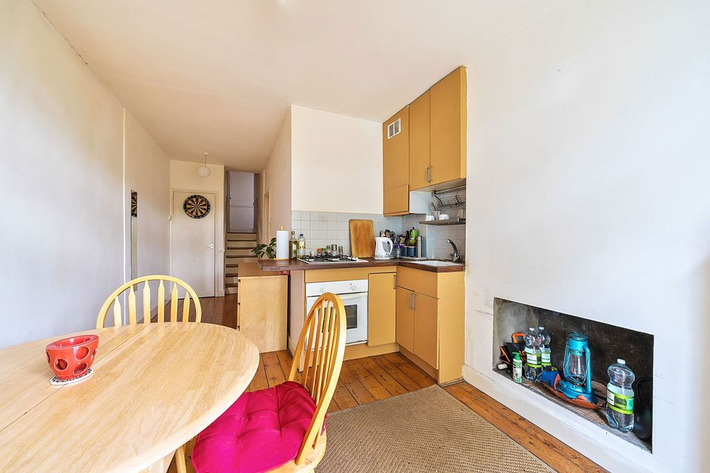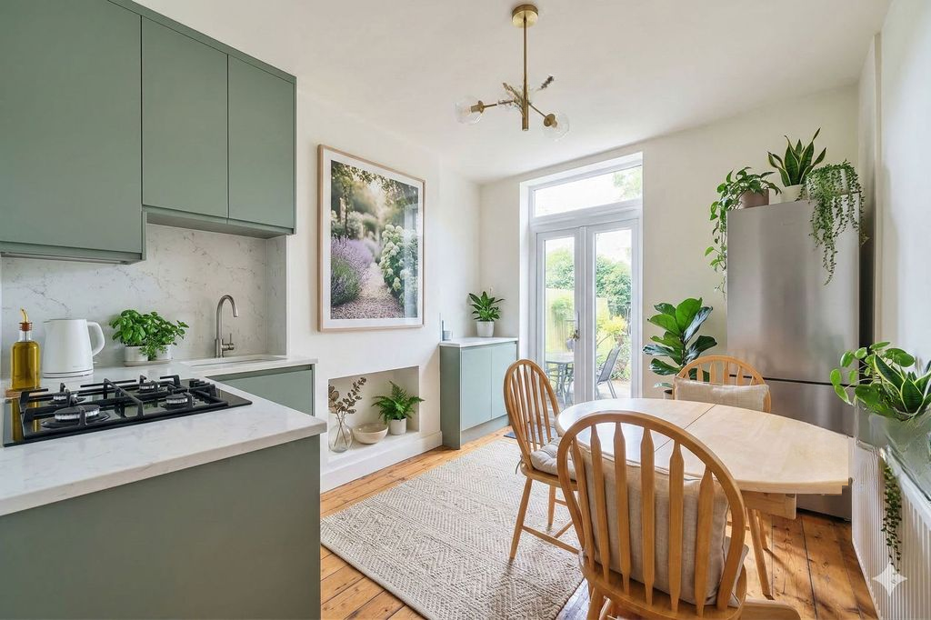 Кухня и столовая находятся в задней части квартиры и выходят прямо в сад через французские двери. Это открытое пространство получает много естественного света в течение дня благодаря направлению на юго-запад. Хотя интерьер устарел, потенциал очевиден: у квартиры хорошая основа, практичная планировка, и она готова к полному обновлению — будь то современные линии или более традиционная отделка.