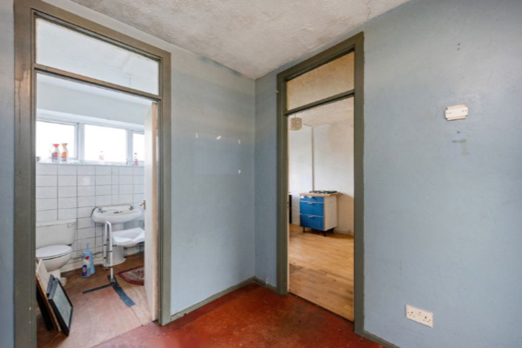 Гостиная 14'2" x 13.11' с большим окном с двойным остеклением. Кухня 10'11" x 9' нуждается в капитальном обновлении, также с большим двойным окном. Главная спальня 13'6" x 10' с двумя окнами с двойным остеклением. Вторая спальня 10'4" x 7'9" с окном с двойным остеклением. Ванная комната 7' x 6'4" с белоснежным гарнитуром и окнами. Внутренний коридор 14'8" x 8', из которого доступны все комнаты. Общий сад 58' x 17', с видом на северо-восток.