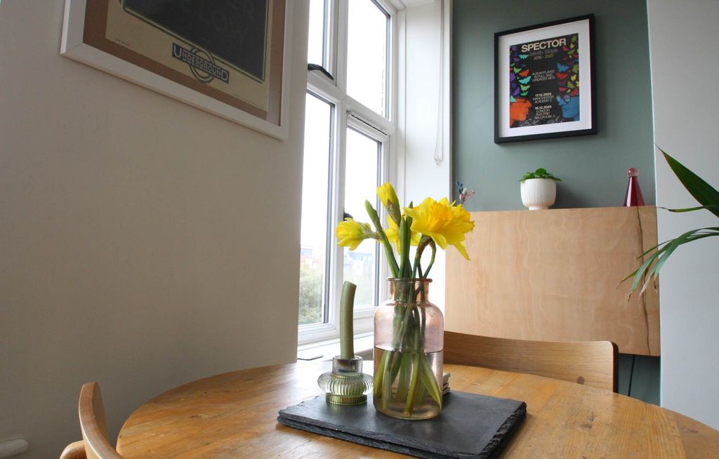 Оригинальная панельная входная дверь ведет в коридор с полом из неокрашенных досок. Непрозрачная стеклянная дверь ведет в гостиную с полированным деревянным полом и окнами с двойным остеклением, предлагающими вид на Лондон. Панельная дверь открывает доступ к умно спроектированной кухне с белыми глянцевыми базовыми и навесными шкафами, деревянными столешницами, индукционной плитой и комбинированной печью с микроволновой печью. Кухня подготовлена для установки узкой посудомоечной машины и стиральной машины/сушилки, а также оснащена скрытым газовым котлом, плиткой на полу и окном с двойным остеклением по боковой стороне.