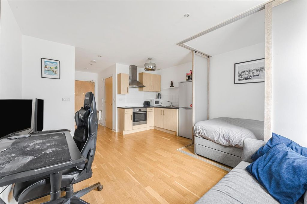 Светлая и хорошо оформленная студия в популярном здании Burnelli, современном комплексе в престижном районе Баттерси. Она спроектирована так, чтобы максимально использовать пространство: просторная гостиная открытой планировки с большими окнами для естественного света, оборудованная кухня с встроенной техникой и раздвижная перегородка, аккуратно отделяющая спальную зону от основного жилого пространства.