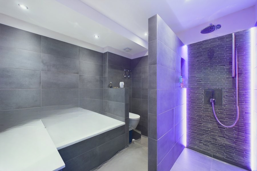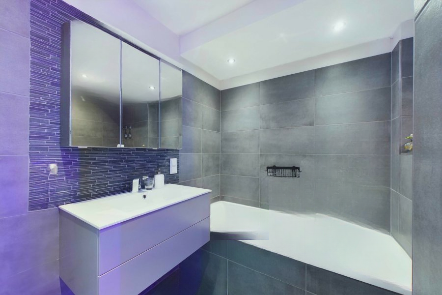 Санитарные удобства: одна ванна, два душа по принципу "walk-in", два туалета. Отопление осуществляется с помощью газа. Окружение: тихий жилой район с детским парком в 500 метрах, супермаркет и магазины в Cloche d'Or.