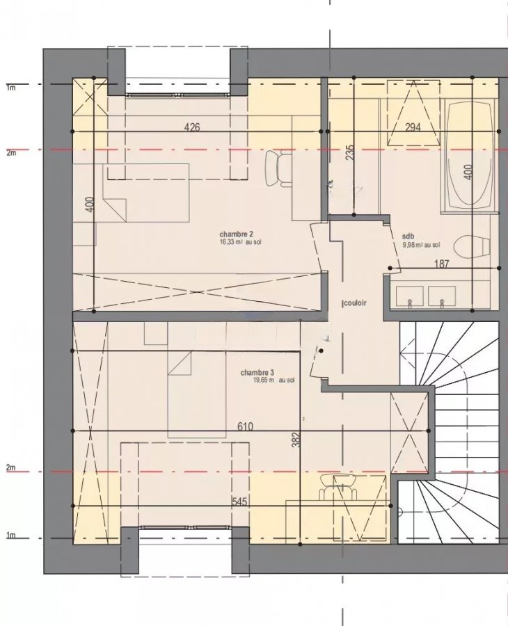 На верхнем уровне расположены: ванная комната с WC около 10 м², спальня около 16 м² и третья спальня более 19 м².