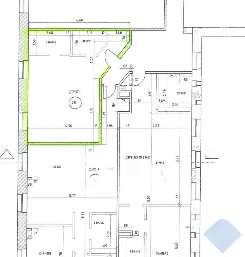 Состав студии: первый этаж: прихожая (4,03 м²); кухня (3,37 м²); жилая/спальня (26,12 м²); душевая (4,02 м²); подвал на первом этаже.