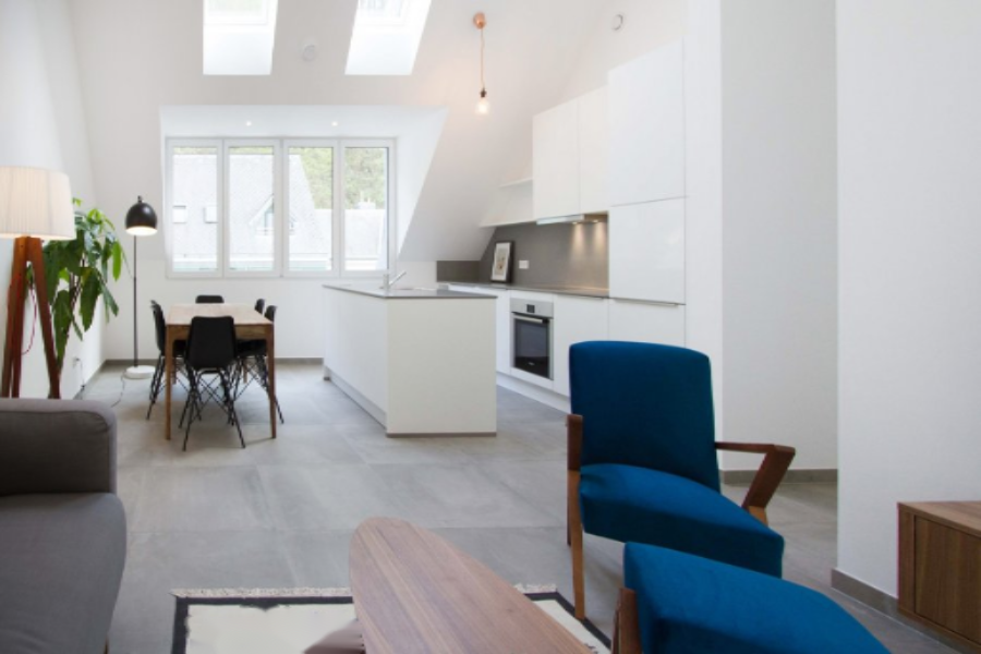 Шикарный меблированный пентхаус с двумя спальнями в Neudorf. Расположен в особняке 1930-х годов, полностью отреставрированном в 2015 году, с сохраненной оригинальной фасадой и современными минималистичными интерьерами. Совмещенные бетонные потолки и индустриальный стиль пола подчеркивают сочетание грубой элегантности и современного комфорта.