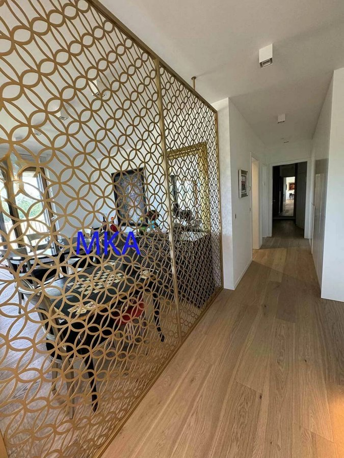 Планировка включает: холл с безопасной дверью; просторная гостиная-столовая с большими окнами, выходящими на террасу площадью 83 м², частично закрытую (зимний сад 30 м²); хорошо оснащенная кухня открытого плана; туалет с умывальником. Ночной холл оборудован большими встроенными шкафами.