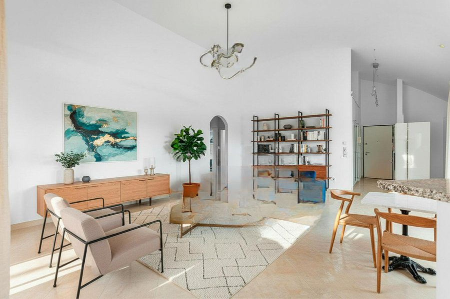 Войдя внутрь, вы мгновенно почувствуете очарование основной жилой зоны, состоящей из гостиной-кухни и офисной зоны. Просторный светлый зал с высокими потолками. Кухня открыта к гостиной и хорошо оборудована, что позволяет наслаждаться компанией, не отлучаясь. Из гостиной можно выйти на две красивые террасы по 16 м², расположенные на запад, и насладиться видом на спокойный жилой район.