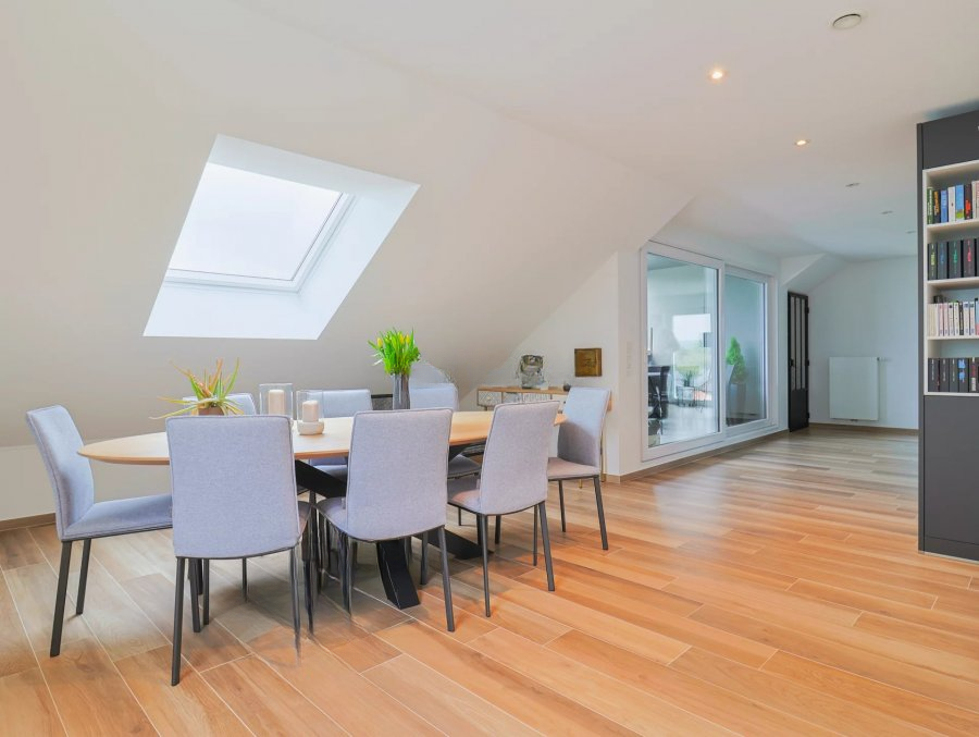Эта превосходная квартира площадью 119 кв. м (99 кв. м жилой площади) расположена на втором и последнем этаже современной резиденции 2019 года постройки, в тихом тупике в Hobscheid (Кантон Capellen).