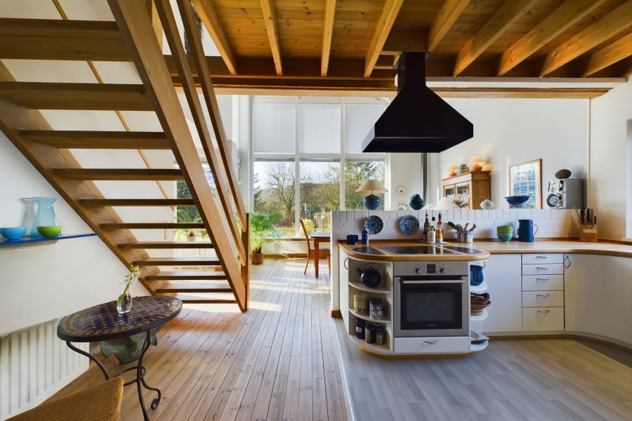 На первом этаже: - Входную зону с шкафом - Величественную гостиную с оборудованной кухней (63 м²), полностью застеклённую с видом на сад - Ночную зону - Две спальни - Ванную комнату с душем, двойной раковиной и туалетом - Прачечную