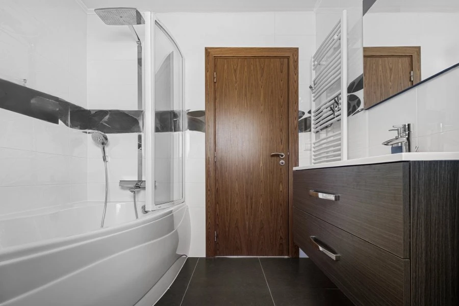 Третий этаж: Лестничная площадка обеспечивает доступ к ванной комнате площадью ± 6 м² (с раковиной, ванной, туалетом, сушилкой для полотенец и окном), двум спальням площадью ± 14 м² и 16 м², а также кабинету площадью ± 8 м².