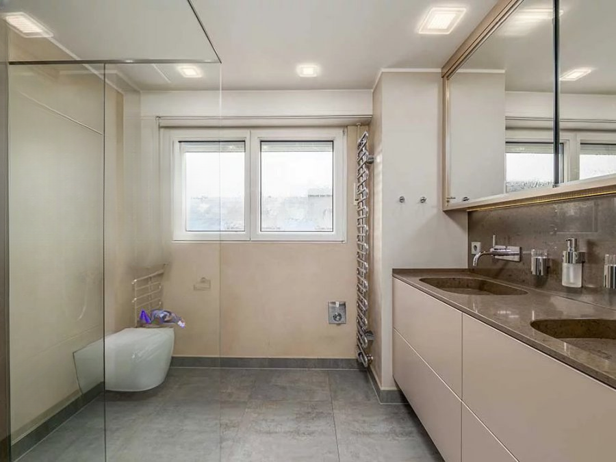 На первом этаже расположена светлая гостиная с встроенным стеллажом и террасой, также обращенной на юго-восток; высококлассная отдельная кухня от Huber&Huber; гостевой туалет и гардероб.