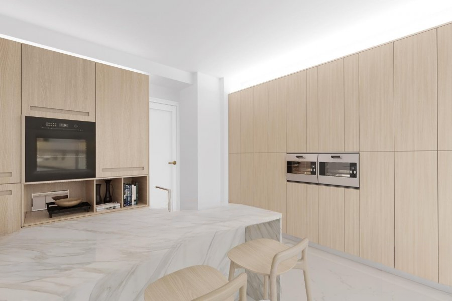 Прихожая оснащена встроенными шкафами. Жилая площадь 56 м² залита естественным светом, с элегантным травертиновым полом и высокими потолками. Она выходит на террасу площадью 10 м², которая предлагает панорамный вид, защищённый от посторонних взглядов, и дарит атмосферу уюта благодаря идеальному восточному расположению для наслаждения восходом солнца.