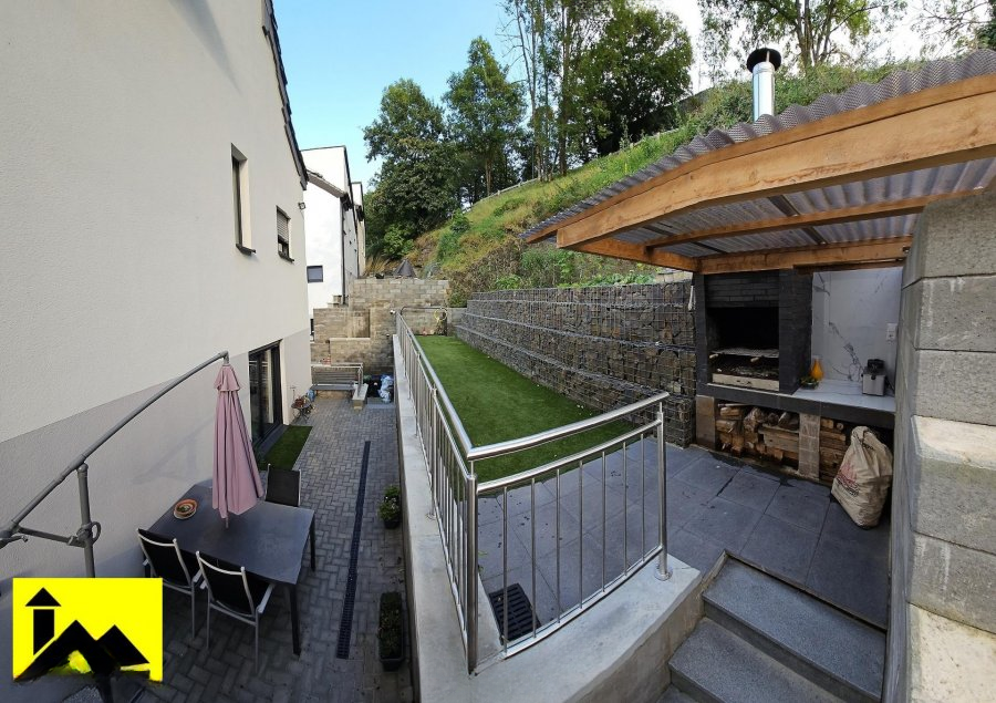 Прекрасный двухквартирный дом с более чем 200 м² жилой площади на участке в 3.19 ар, включающий: просторный коридор, 3-5 спален (включая главную спальню с гардеробной и ванной комнатой с итальянским душем), кабинет / преобразованный чердак, оборудованную кухню, выходящую в столовую / гостиную с выходом на большую террасу с барбекю, вторую ванную комнату с итальянским душем и 2 отдельные туалеты. Чердак переделан под игровой или фитнес-зал с доступом на вторую террасу, откуда открывается потрясающий вид на замок Bourscheid, погреб/кладовую, котельную, прачечную, гараж, двор / парковку на 3 автомобиля и сад.