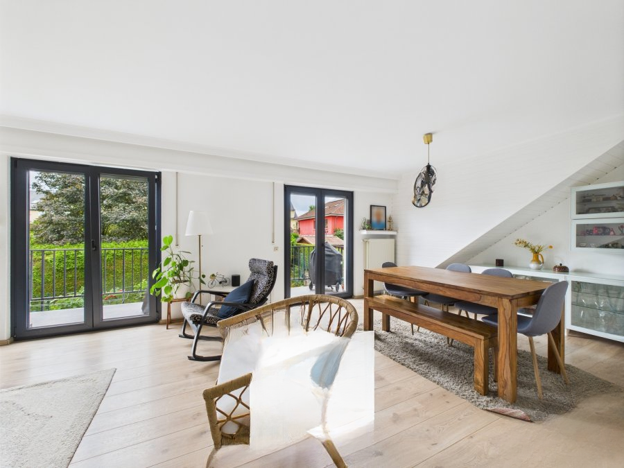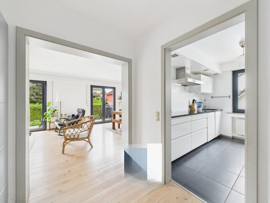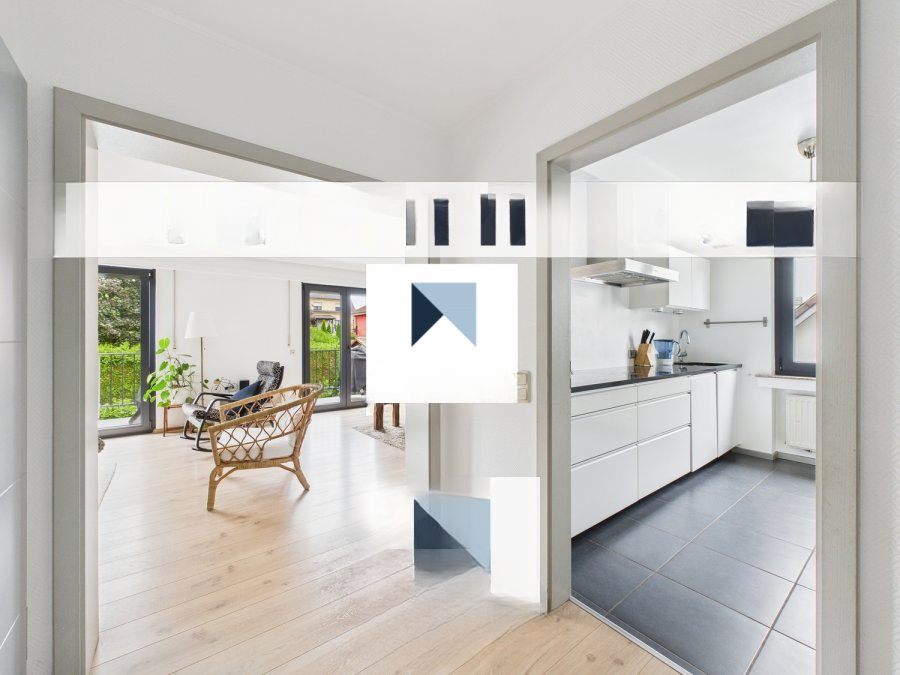 Вход ведет в приветливый холл, из которого можно попасть в современную независимую полностью оснащенную кухню (± 8 м²), а также в просторную светлую гостиную площадью ± 31 м². Из последней через раздвижное окно можно выйти на балкон, ориентированный на юго-запад, площадью около 6 м², идеально подходящий для наслаждения солнцем в конце дня.