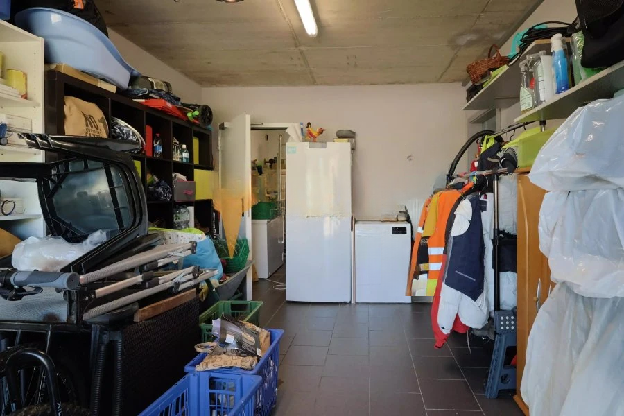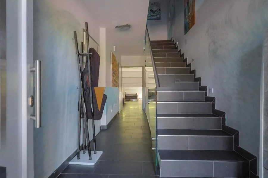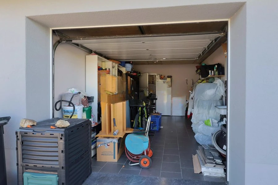 На первом этаже находится входная зона, отдельный туалет и гараж для одной машины с подключением для стиральной машины. Также здесь располагается просторная гостиная с полностью оборудованной кухней, обеспечивающая доступ к террасе и саду.